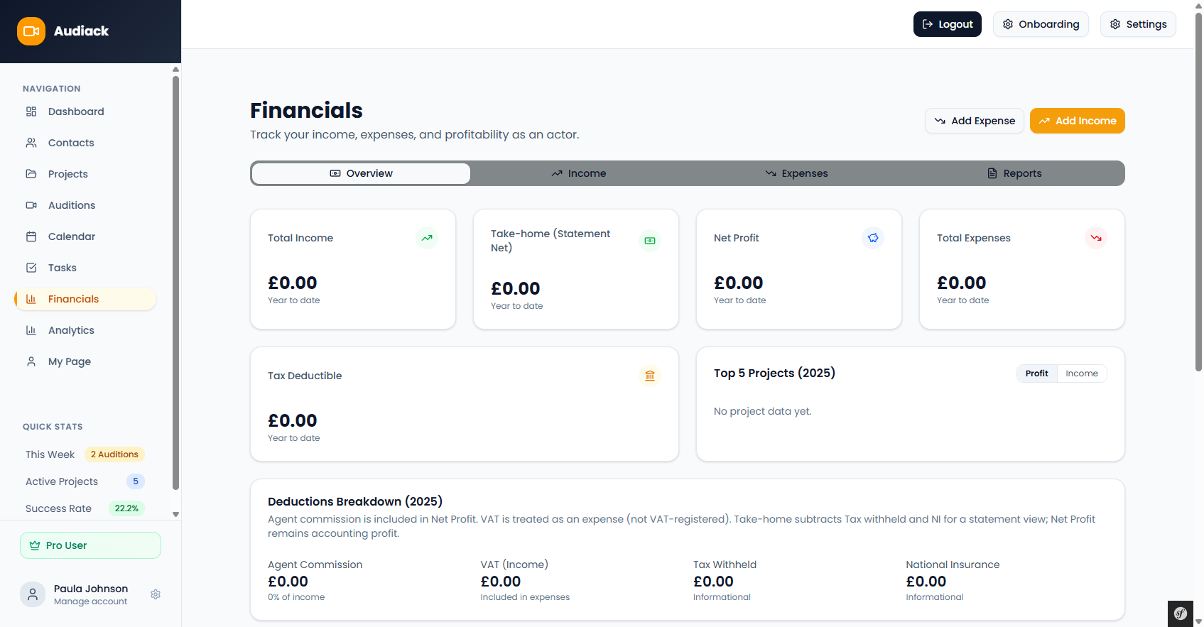 Monitor acting income, expenses, and yearly totals.